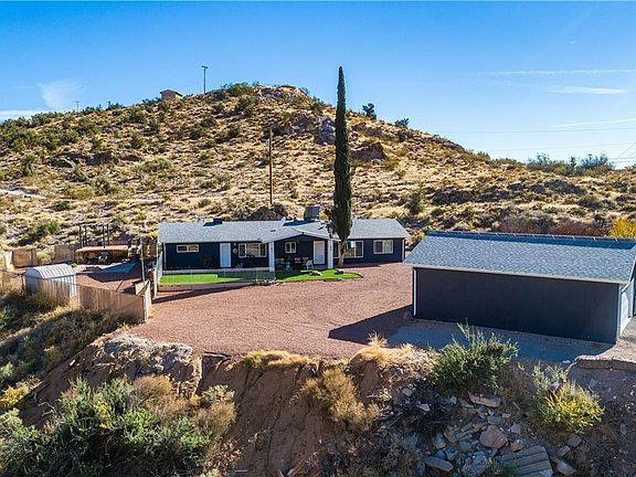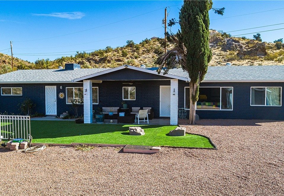 Experience the unparalleled charm of this exclusive, solitary retreat that seamlessly combines seclusion with proximity to amenities. Nestled on a vast 1.15-acre lot, this 4-bedroom, 2-bathroom residence offers panoramic views in every direction, ensuring a truly unique living experience. Revel in the blend of modern updates throughout the entire home, complemented by a fully paid solar system poised to significantly reduce your monthly power expenses. Step into a meticulously upgraded interior featuring a renovated kitchen, living room, and bathrooms, all within the solidly constructed elegance of this 1970s gem, ingeniously built into the surrounding rocks. Discover the added luxury of a bonus craft room or hobby area, complete with a rare and spacious walk-in pantry. For the adventurous spirit, your hiking oasis waits you just down the road at the White Cliffs Wagon Trail Park. Boasting over 2100 square feet of thoughtfully designed space, this house unveils a chef-worthy kitchen, setting the stage for delightful culinary experiences. Entertaining becomes second nature on your custom deck, designed to accommodate a 20-foot above-ground pool. Unwind as you witness breathtaking sunsets each evening in this ultra-convenient location, harmoniously balancing modern conveniences with the tranquility of the Mohave Desert. Your dream lifestyle beckons, just moments away.