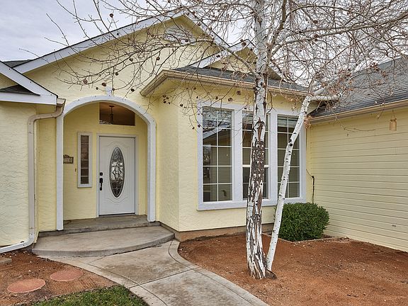 Completely remodeled in 2016, this North area property features stylish upgrades all within a marvelously designed three bedroom two bathroom ranch-style home. A multitude of roof angles and enormous windows from every view, this home will capture your attention and draw you in with its sprawling lawns, custom fencing, and mature aspen trees. With its two-car garage, this home features a welcoming and covered front entrance; but step inside and you’ll be inspired by the open, spacious foyer with its oversized tile flooring, elegant lighting feature, and bright windows. Just off the foyer, a gorgeous home office faces the front of the home through a wall of windows. Elegant and profound, this home’s living room is entered through a masterful arched ceiling and columned walls. In here, you’ll find stunning wood grain tiled flooring, vaulted ceilings, and an expansive entertainment wall. Centered in this space, a gas log fireplace is highlighted by a tile surround and custom wood accents and mantel. French doors center the dining room and lead out back to the entertainment patio. With new complementing countertops, the kitchen glows with its custom tile backsplash, honey-toned cabinetry, and all new stainless steel appliances. A new oversized single bowl kitchen sink with new stainless faucet looks out over the entertainment counter. A true master suite, the grand master bedroom opens to wood grain tile flooring, arched windows on every wall, and a one-of-kind suite and sitting room. Space abounds in this luxurious room where the five-piece master bathroom boasts new countertops on the double-sink vanity, an elegant garden bathtub, and a beautifully tiled walk-in shower. A second sizable bedroom hosts lush carpeting while a third bedroom features wood grain tile flooring and a custom lighting feature. Serving the home, the main bathroom is customized with a double-sink vanity, tile framed mirror, and tiled bathtub surround. Outside, this home is further enhanced by an expanded patio with a pergola. Sprawling lawns blended with a dog run, storage shed, and entertainment patio make this backyard a private retreat. Hand-textured walls and crown molding along with all new interior paint add to this home’s immaculate and elegant detailing.