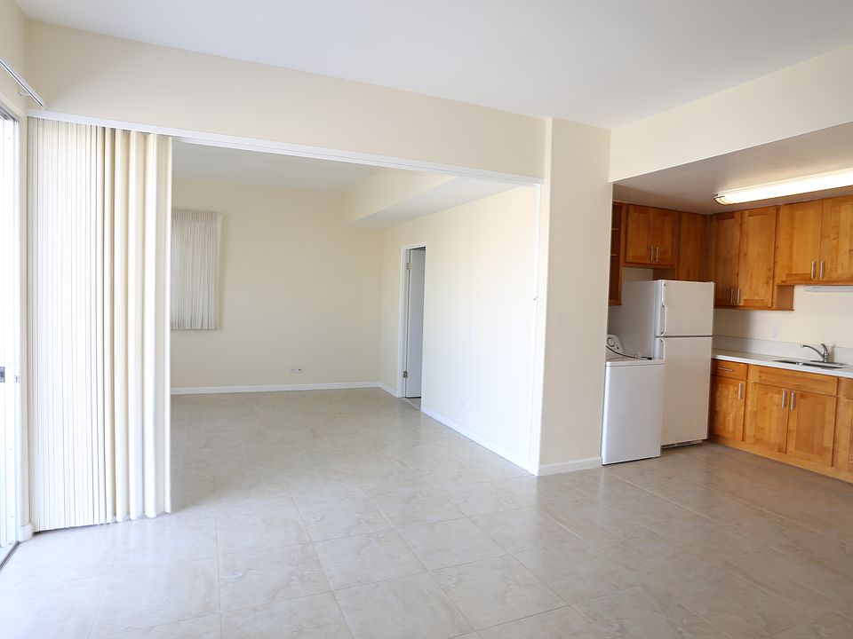 Pleasanton - 1 bedroom, 1 bathroom condo on 10th floor with approx. 568 sq. ft. of interior space. Secured building located across from Punahou School. Tiled floors throughout. Accordion divider between living room and bedroom allows for large open space. Window ac in living room. Lanai. Mountain and city views. Appliances include: new refrigerator to be installed, glass top stove, microwave hood, disposal, and washing machine. (No dryer or dryer hook-up.) 1 uncovered assigned parking stall. Monthly rent of $1,700.00 includes water and sewer. Initial lease term: 1 year. No pets. No smoking.