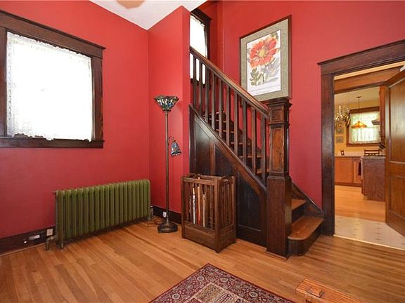 Beautiful brick home with gorgeous details, from gleaming wood floors to built in bookshelves, French doors, original fireplaces. to stained glass light fixtures, combined with modern features from high efficient boiler to central air, new windows, and insulation. Large light filled rooms. Eat in Kitchen with beautiful granite counter tops and cabinets, and lots of space for cooking and sharing. Entry way with room for greeting guests, stained glass light fixture, wooden banister leading to second floor, large bed rooms, master suite with bathroom, large third floor, fourth bedroom or family room. not to mention, a large basement with high ceilings. Relax on your large front porch, Play any game you can imagine on your HUGE, LEVEL yard. 2 car garage AND workshop. Come visit, you will want to stay!