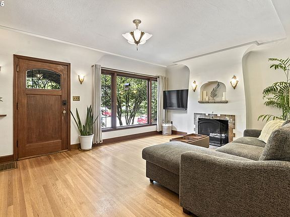 Step into timeless charm with this enchanting Tudor, just one block from vibrant Hawthorne Boulevard. The welcoming front porch leads into a warm and inviting living and dining area, featuring original mahogany trim, a cozy wood-burning fireplace, oak floors, leaded glass windows, and classic period details. French doors off the dining room open to a lush backyard oasis.The cheerful updated kitchen includes a delightful breakfast nook, perfect for morning coffee. Two bedrooms and a full bath are conveniently located on the main floor, while upstairs you'll find a spacious and private primary suite with bath.The partially finished basement adds versatile living space, including a fourth bedroom, cellar, workshop, storage, and excellent ceiling height. Enjoy outdoor gatherings in the fully fenced backyard with a sitting area overlooking the pond. A one-car garage completes this exceptional property. Don’t miss your chance to own a beautifully maintained classic in one of Portland’s most sought-after neighborhoods! [Home Energy Score = 5. HES Report at https://rpt.greenbuildingregistry.com/hes/OR10183932]