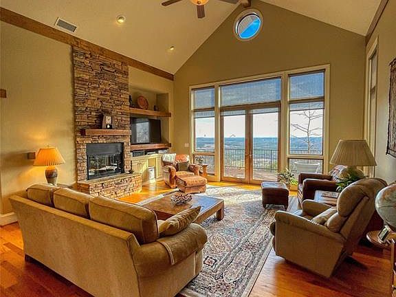 Welcome to 1710 Sierra Trace. The home is situated so that every main room features long range views of the Uwharrie National Forest, and Tuckertown reservoir. Upon entering you will be greeted with 14' ceilings, and accent rope lighting. Living room has vaulted ceilings, long range views and double stone fireplace. Hardwood flooring covers the main level(no carpet) open kitchen w/ island and breakfast area. Primary suite offers long range views, dual vanities, garden tub, and walk in glass tile shower. Lower level consists of 2 bedrooms,2 full baths, playroom, large workshop, and plenty of storage space. 3 car attached garage and utility space. Do not let this opportunity get away to own a custom built one owner home in The Springs at High Rock Lake. Walk through, floorplan, and drone aerials to be uploaded soon. Agents please note that the refrigerator and tv in the basement is to remain. Seller will not remove
