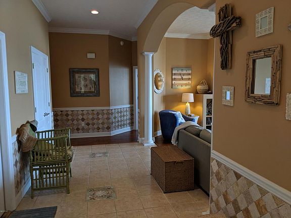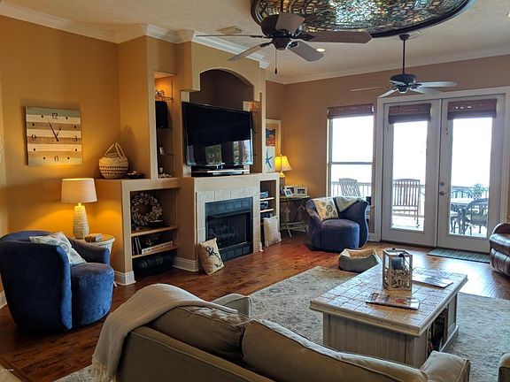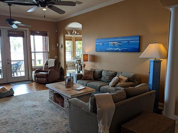 MINIMAL STORM DAMAGE! REPAIRED BY SELLER! Enjoy the tranquility of this tropical BAY FRONT HOME. The view from the living room and kitchen is spectacular! Many high-end finishes throughout the home including Tuscan tile in the gourmet kitchen, granite counter tops, plenty of cabinet space, display plate rack and stainless steel appliances. High ceilings, crown-molding and tumbled marble wainscoting throughout. Master bedroom also has incredible Bay view, his and her walk-in closets, large master bath with marble countertops, garden tub and walk in shower. Three additional bedrooms with ample closet space, as well as another full bath. Surround sound in all rooms as well as outside at pool and in the garage.