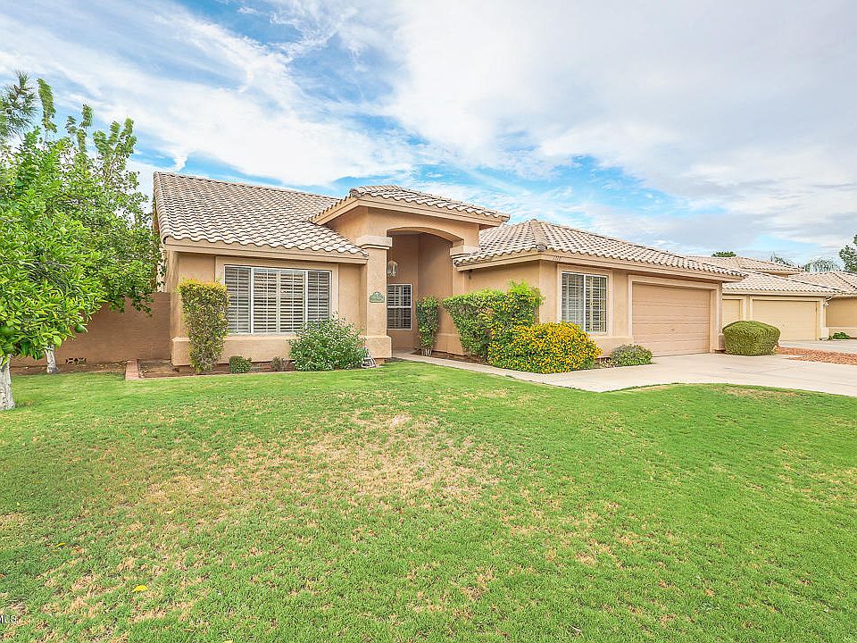 This gorgeous, newly updated, Chandler home is pristine and move-in ready! A formal living and dining room welcome you. The island kitchen boasts abundant white cabinetry, granite countertops, white subway tile backsplash, stainless steel appliances and a desk nook. Chic tile flooring, white shutters/blinds, ceiling fans, raised panel doors throughout. The huge master suite features a walk-in closet, separate shower and garden soaking tub, double sinks, granite countertops and a double door entry.