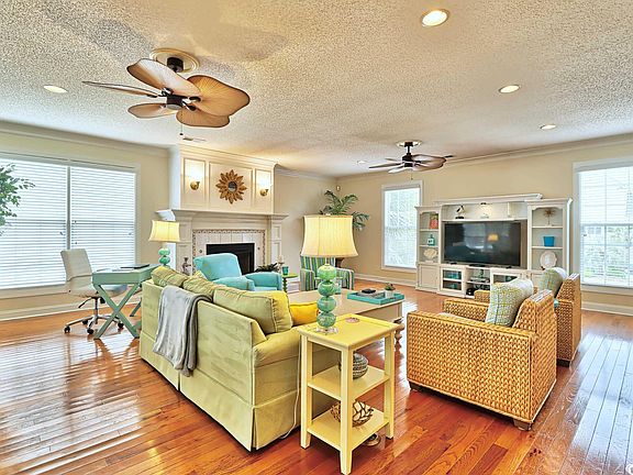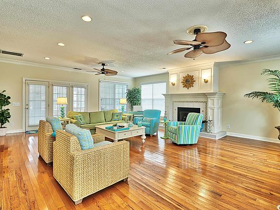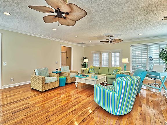 This stunning home is in Sunset Harbour, a desirable Intracoastal Waterway neighborhood, and provides owners with the finest coastal lifestyle. The home offers views of the waterway and a tranquil neighborhood pond with two light-up fountains. The thoughtfully designed floor plan provides one-story living while providing extra room for visiting family and friends. Visitors are greeted by a front porch, and immediately inside, see magnificent double-height ceilings in the foyer and an open staircase. A large dining area opens to a bar that seats four and a roomy chef's kitchen with a large island, custom white cabinets, and a sizable pantry. Unique finishes and touches include crown moldings and, stained hardwood floors, gas logs, and it is loaded with storage. Light and bright with a double bank of floor-to-ceiling windows in the living room, a large sunroom, and a huge deck that makes for a great "gathering" area. The owner's suite on the main floor has two sizable walk-in closets and access to the rear deck for quiet leisure. Awesome bath with two vanities, granite countertops, tile flooring, a separate water closet, a sizable, jetted soaker tub, and a separate walk-in shower. The main living level also has a laundry area with a utility sink, lots of drawers and shelving, and space for your beach bag. Upstairs two bedrooms share a large bathroom with double vanities, a linen closet, and a separate tub/shower combination. A third roomy bedroom and full bath off the hall. There is also a large office, craft room, media room, or could be 5th bedroom with two very large closets. Two more storage closets and another linen closet offer ample upstairs storage. Outside finds a sizable deck with a large, covered space great for entertaining. There is additional storage under the house and a room under the stairs in the very large garage. The backyard is fenced-in and has numerous flowering bushes and trees, in-ground irrigation, and landscape lighting. Sunset Harbour is sought-after, with a community pool, hot tub, and clubhouse with ICW views. It also offers a private boat ramp with a screened-in pavilion with restrooms. A separate parking area with 2 spaces for your boat/RV/trailer all included in the HOA. Golf cart ride to the Atlantic Ocean. Don’t pass up the opportunity to view this magnificent home! All information is deemed reliable; the buyer is responsible for all verification.
