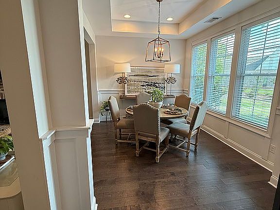 • Open-concept living and dining area with vaulted ceilings and hardwood floors throughout