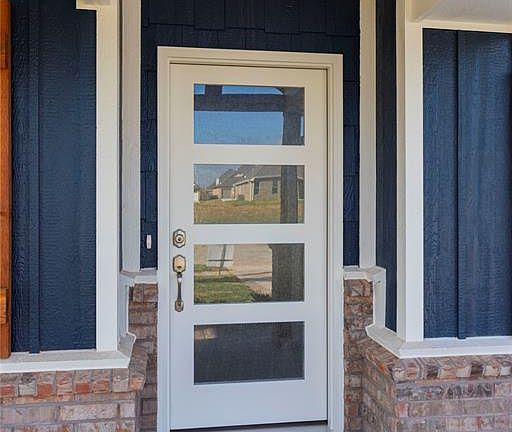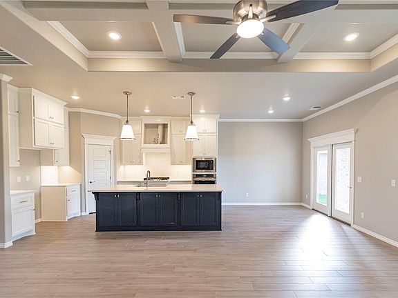 A FENCE WITH 1 GATE INCLUDED! This Shiloh floorplan offers 2,220 Sqft of total living space, which includes 1,950 Sqft of indoor living space & 270 Sqft of outdoor living space. There is also a 625 Sqft three car garage w/ a storm shelter installed. Home offers 4 beds, 2 full baths, 2 covered patios, & a utility room. Great room features a luxurious coffered ceiling, a stacked stone surround gas fireplace, large windows, wood-look tile, & a barn door! Kitchen has stainless steel appliances, cabinets to the ceiling, a center island, stunning pendant lighting, a large corner pantry, & attractive tile backsplash. Primary suite features a sloped ceiling detail, a ceiling fan, & two HUGE walk-in closets. Primary bath has a walk-in shower, a corner Jetta Whirlpool Tub, & separate vanities! Covered back patio includes a wood-burning fireplace, a gas line, & a TV hookup. Other amenities include healthy home technology, a fresh air ventilation system, a tankless water heater, R-44 and R-15 insulation, & so much more!