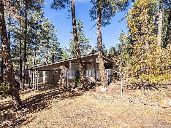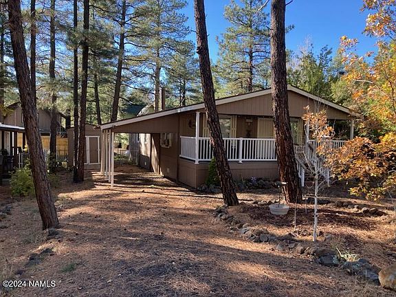 Quiet getaway nestled in the tall pines within walking distance to the National Forest. Three bedrooms, 2 Baths, open floor plan, vaulted ceilings, Wood burning fireplace, full kitchen, dining area and separate laundry room. Good parking including a carport and storage shed. Mostly furnished. Roof on manufactured home, carport and shed was replaced in 2,023.