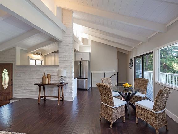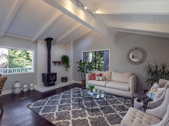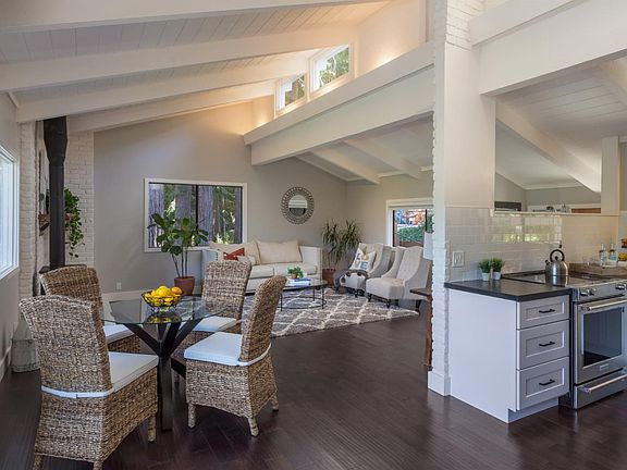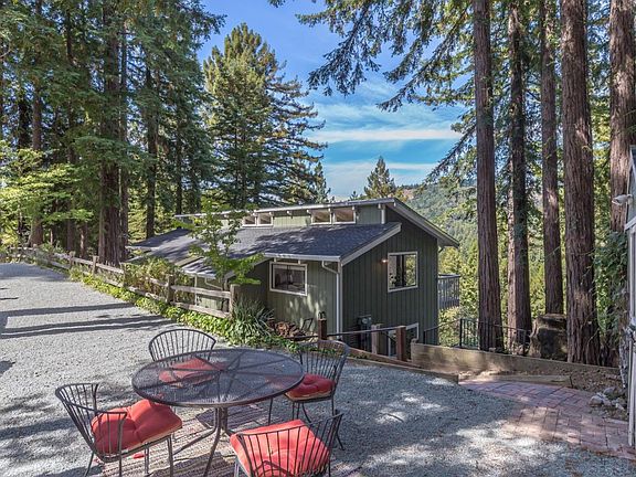 Beautifully remodeled home flanked by majestic redwoods, enjoying an abundance of sunshine and gorgeous mountain views. A charming covered front porch leads to the formal entry. Spacious open floor plan with vaulted ceilings, skylights, and a wall of windows with sliders to the deck. Newly remodeled kitchen with white cabinetry, black granite counter tops, subway tile backsplash, stainless appliances and sink. Also on the main level...master bedroom with office nook, and remodeled full bathroom. Two further bedrooms and remodeled hall bath stay cool on the lower level. Family room or optional 4th bedroom with closet, French doors opening to the lower patio. Idyllic setting between a circle of redwoods and large fenced garden with rustic fencing and gate, raised beds. Ample parking in front of the house and below the redwood grove. Gravel driveway/trail and upper patio, lots of usable area. Trail below. Storage shed. Summit West water co. Excellent Loma Prieta/Los Gatos Schools!