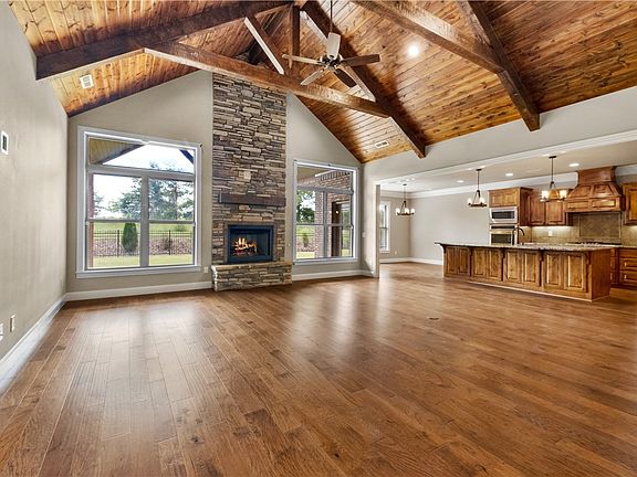 Welcome to your dream home on acreage! This like new 2018 built home on 9.36 acres of pristine land is sure to impress with its included 2,400 sqft detached shop for all your vehicles or toys! Boasting an expansive open floor plan interior with soaring cathedral ceilings and wood detailing, a stone fireplace, wood flooring, and plenty of natural light streaming in - this home has it all! The breathtaking eat-in kitchen features granite countertops, gas range, double oven, and an oversized island that is perfect for entertaining. Enjoy your morning coffee on the large covered front porch or unwind after work on the spacious covered back patio. Retreat to the relaxing primary suite with its spa-like ensuite bathroom featuring a soaking tub, tiled shower, his & hers vanities and roomy walk-in closet with plenty of built in storage. Also there is a "safe room" in the Master closet. Don't miss out on this one of a kind countryside escape today!