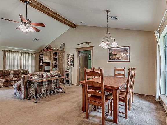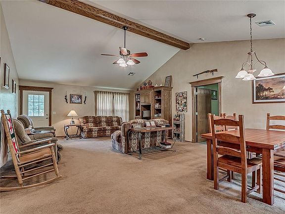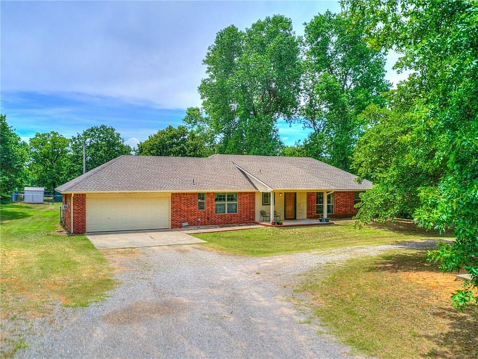 Charming and spacious home on a stunning partially wooded 5 acres. This home has a very well designed floor plan with 1,652 SF, 3 bedrooms, 2 bathrooms, 2 car garage, and is full of charm. Features include vaulted ceiling, formal dining, large kitchen with breakfast nook and office space, inside laundry room, split floor plan, tons of storage, lots of natural light, spacious bedrooms, master suite, partially fenced 5 acres, gated entry at the driveway, and lots more. You have great privacy but also are only minutes from highway access for a short commute to Tinker AFB, Boeing, shopping, dining, groceries, and more. Call today for a private showing.