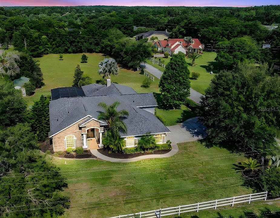 One or more photo(s) has been virtually staged. **Seller Motivated, bring reasonable offers** Welcome to your oasis nestled in the serene Keystone area of Odessa, FL. This Executive Home sits on a sprawling 1.6 Acres of lush greenery, offering privacy while still being conveniently located everything. Boasting an expansive 3,720 sq ft of living space, this property promises an enviable lifestyle of comfort, privacy & leisure. There is no shortage of space w/4 Bedrooms, 3 Baths, Office & Bonus Room. As you enter the great double doors, you're greeted by a spacious & inviting foyer w/ornate pillars, leading you into the heart of the home w/a view of the beautiful screen enclosed Pool. This split floorplan offers the utmost in privacy. The Large Living Room has sliding doors to the Pool Enclosure & is also open to the Dining Room & leads you to the massive Kitchen & Family Room. This open concept integrates the Family Room & Eat In Kitchen areas creating the perfect space for entertaining guests. The gourmet kitchen is a chef's delight, 42 inch cherry wood cabinets w/granite countertops, breakfast bar, stainless steel appliances, & ample cabinet space for all your culinary needs along w/a center island providing additional prep space. The cozy family room boasts a wood burning fireplace, w/ornate mantle, built in Shelving & trey Ceiling creating an inviting atmosphere for gatherings w/another amazing view of the Pool Enclosure. Large windows throughout the home flood the space w/natural light, illuminating the beautiful Luxury Vinyl Flooring & finishes. Retreat to the luxurious Primary Suite, where tranquility awaits. This large Suite also has a trey ceiling, walk in closet & sliding door out to the Pool for those late evening swims. This private sanctuary features a spa-like ensuite bathroom w/dual vanities, a soaking tub, & a separate walk-in shower. Three additional bedrooms & two bathrooms (Pool Bath) provide plenty of space for family & guests on the opposite side of the home. Plus, there is an enormous Bonus Room in the back of the home w/ transom windows, built-in shelving & plenty of space to make an In-Law Suite out of…other neighbors have done this or just perfect for additional space for the family & their hobbies w/access to the Pool Enclosure. Step outside to your own private paradise, where a screened-in pool & paver patio await. Whether you're lounging poolside w/a refreshing drink or hosting a BBQ w/friends, this outdoor oasis is will impress. The patio is plumbed already for an outdoor kitchen w/an amazing view of the Pool & Backyard. This enormous 1.6 Acre Lot has so much to offer along w/a large 19x8 Storage Shed used to store the lawn mower & equipment. You are allowed to have Horses for the Equestrian Enthusiast. Plus, you will love the picket fence that borders the entire lot creating a fun & safe haven for your pets & family events. Back into the home, the Utility Room has a utility sink & WD off the side entry 3-car garage w/ample storage space for recreational toys. Roof 2019; 2 AC Units 2016. NO CDD & Very Low HOA with little restrictions. Located in Odessa’s Keystone Community, this home offers an escape from the hustle & bustle while still being conveniently close to the Trail, Library, Park, Shops & Airport. From its impeccable schools to its unbeatable location & community feel, you are guaranteed to live your dream lifestyle. Come Make it Your Own! OWNER OCCUPIED!!!!!