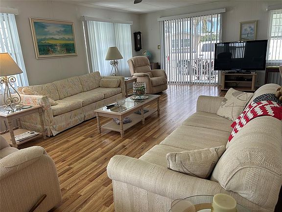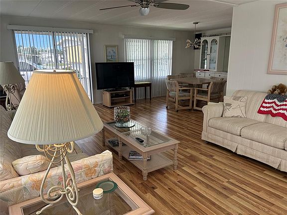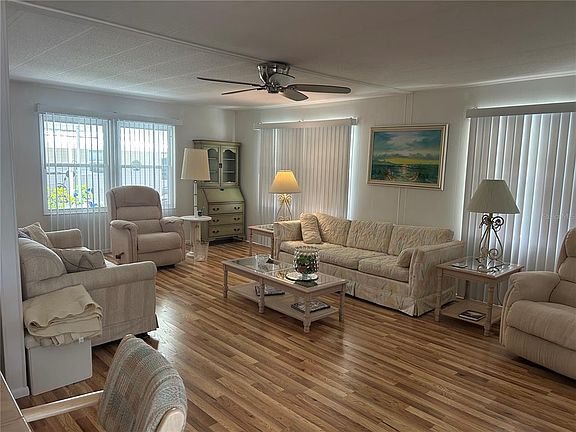 Awesome location - In dog allowed area - Beautiful backyard view of wooded area. Brand new roof on this home installed December 2024! Great open floor plan, roomy Liv Rm & Din Rm flooring is newer - windows have been replaced, well cared for, large lania, fenced back yard, working kitchen - so much to like about this property. Everything stays except personel items & small table in Living Rm. Golf cart does not stay. Tri-Par Estates is a 55+ community in which you own your home and the land. Park fee of $1,648.00 a year is part of the property taxes paid once a year, includes Frontier internet, cable also trash. There is a large pool, mini golf, laundry facilities, fitness room, clubhouse, and many activities to enjoy. Just minutes to the airport and with many other necessities nearby like hospitals, shopping, restaurants and more. Airplanes & jets do fly over Tri Par Estates. Certainly a property to consider