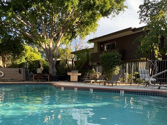 Large poolPeaceful travertine private courtyardLush mature treesPatio with sunset viewsCustom closetMotorized solar screensBrick walls