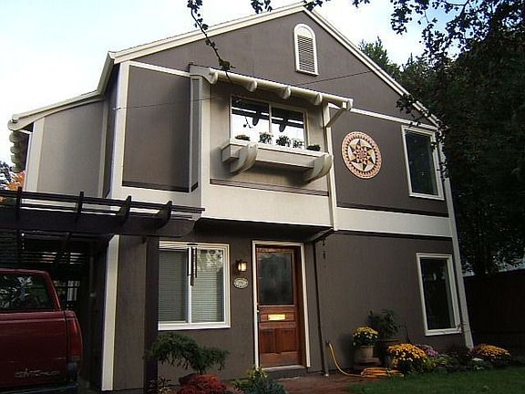 Portland Trend in Historic Forest Grove! One of the original custom build Green Gable sustainable homes featuring stained concrete floor, wall of windows, Hi-Ceilings, exposed beams, lofted bedrooms, updated kitchen, office with French doors leads to updated covered wrap deck, private yard with large shed & garden area, newer roof, fresh interior/exterior paint, all appliances stay!