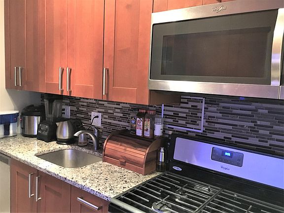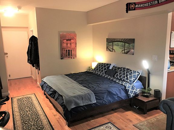 The 520 square foot studio has stainless steel appliances (including a dishwasher) and granite countertops. It comes with ample storage with two large closets, including a walk-in. It also features large windows with blackout curtains for sleeping in!