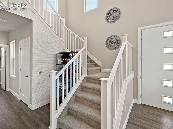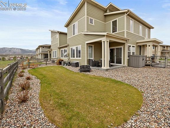 Welcome to this beautiful and upgraded paired home in the “small town feel” of Monument, Colorado! Nestled in Wagons West, a community at the base of the Front Range with quick access to biking, walking, and hiking trails, Air Force Academy, and the I-25 for easy commute to Denver or downtown Colorado Springs. Enjoy the mountain views from the main level primary bedroom with an en-suite and walk-in closet. This home has luxury vinyl plank flooring throughout the main level. The kitchen includes quartz countertops, full 42 inch cabinets, a huge island, gas range, timeless white tile backsplash, and a pantry. Step out the sliding door to a covered patio with recessed lighting, backyard (yes!!) that is maintained by the HOA, and an open community space just beyond the fence. Upstairs you have two additional bedrooms, a loft/flex space, and a full bathroom with a linen closet. This home is the largest floorplan of the neighborhood and boasts upgrades for a premium feel.