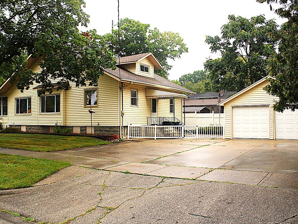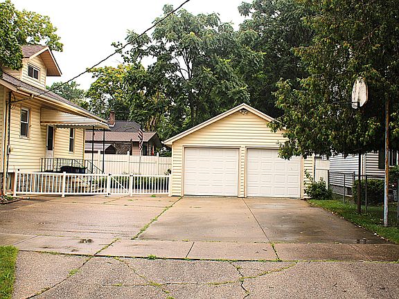 Corner lot in a quiet neighborhood! This 3 bedroom 2 bath home features a gas fireplace, enclosed front porch, finished basement with bar, tons of storage areas and a 2 car detached garage! Located on the main floor is the kitchen, huge dining & living room, den with fireplace, master bedroom and full bathroom. Upstairs are 2 bedrooms with one side being very large with additional smaller room attached where you will find attic access for storage. The other side is separated into 2 smaller rooms but could be opened up if desired. In the basement you have the laundry area with small kitchen set up, bar room, full bathroom, storage room and utility room with wood burning stove and workshop space.