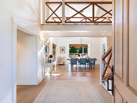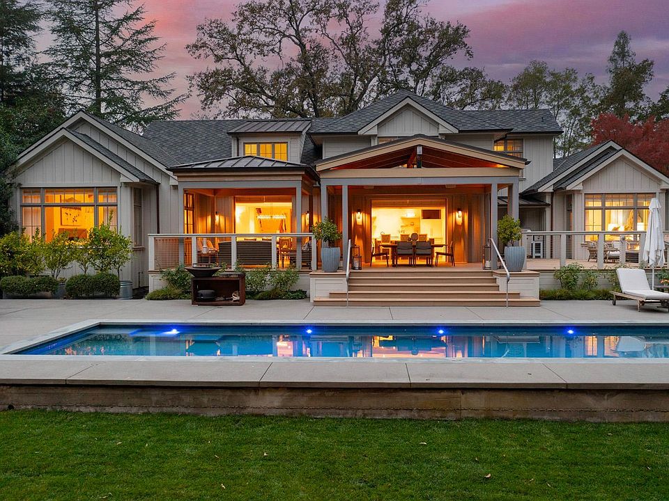 Situated just beyond the downtown core of St. Helena, this extensively updated residence offers a rare balance of privacy, scale, and architectural refinement. The home is oriented toward the rear of the property, where a series of outdoor spaces unfold, including multiple patios, a bocce court, mature redwood surroundings, and a resort-style saltwater pool. Despite its proximity to town, the setting remains enclosed and notably quiet. Interior spaces are defined by a well-considered floor plan, quality materials, and strong natural light. The kitchen serves as a central gathering point, featuring premium appliances, substantial storage, and direct connection to adjacent living and dining areas. A nearby temperature-controlled wine room provides both functional storage and visual interest. The primary suite is located on the main level and includes dual walk-in closets, a seating area, and a generous en suite bath. An additional office or den on this level allows for flexible use. Vaulted ceilings, skylights, expansive windows, and pocketing glass doors create a consistent relationship between interior spaces and the outdoors. The upper level includes three guest bedrooms and two bathrooms, offering comfortable accommodations for family and guests. Located within minutes of St. Helena's restaurants, wineries, galleries, and boutiques, the property offers a composed residential setting with convenient access to downtown's amenities.