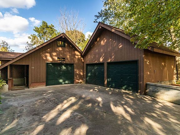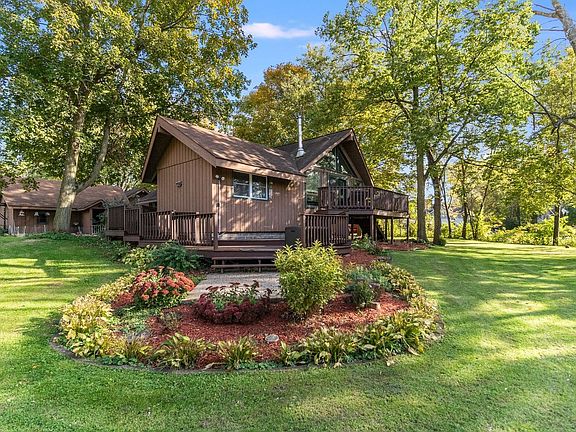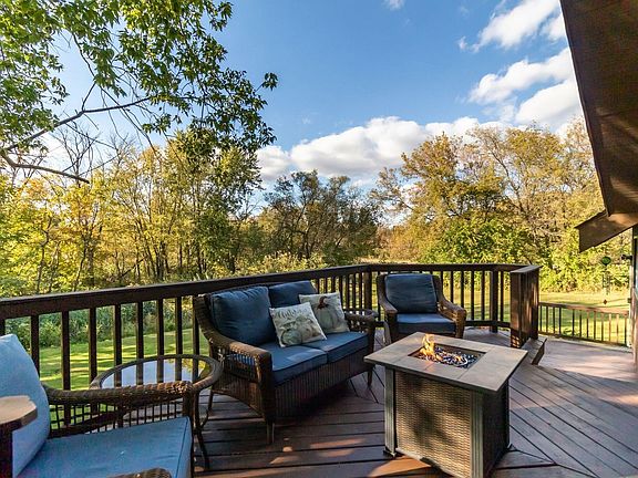 This beautiful and unique home on 1.8 acres is tucked serenely into the trees but sits so close to town! Enjoy the deer go by and see nature at its finest on the new three level deck. Turn on the fire table on those cooler nights. Stocked pond. 4 bedrooms, 2 1/2 baths. Brand new furnace and air conditioner. Lower level has new paint and carpeting throughout. Living room features wall of windows and double french doors to enjoy the scenery. Private setting but easy walk to town and right next door to fairgrounds and golf course.