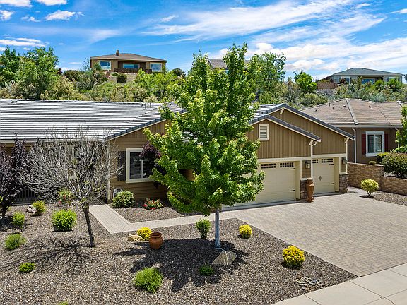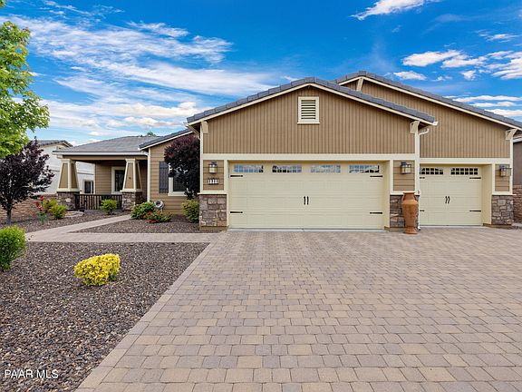 Beautiful upgraded home with fabulous views of the Dells and SanFrancisco Peaks in the back yard and Granite Mountain in the front. This open floor plan can be easily a true 3 bedroom. Home has upgraded tile in the kitchen, living, baths and walk ways. The kitchen has beautiful upgraded granite counters. The master bedroom bay window has been extended two feet. The master bath has a large walk in closet, jetted tub with upgraded tile back splash. This home has a 4 ft extended 3 car garage perfect for a work shop and large vehicles. The landscape is upgraded on a drip and the paver patio has been extended fourteen feet to enjoy the view. Clubhouse with indoor outdoor pools, fitness, restaurant etc. Please see upgrade list for additional upgrades in documents