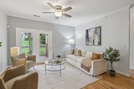 Private covered patioGround-floor condoPeaceful green spaceOne-level livingCrown moldingVersatile flex roomSplit-bedroom floor plan