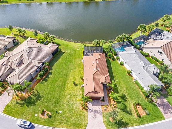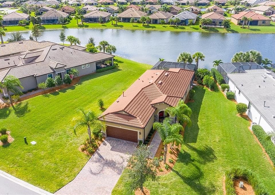 Imagine the perfect Florida home with all of the bells and whistles you would find in a model home. No need to imagine! This is the one! This heavenly home sits on one of the best lots in Del Webb with sweeping views of the lake which can be seen from the moment you enter the front door! You'll love the open floor plan with over $60k in upgrades including stainless steel appliances, stylish plantation shutters, driftwood-plank tile floors, 42" cabinets with crown moulding trim, natural stone countertops, gorgeous glass tile backsplash and freshly painted this year & more! Gather in the kitchen around the breakfast bar island and enjoy a feast prepared on the natural gas stove! The owners suite is spacious and well equipped with a fabulous walk in closet featuring built in organizers, and the owners bathroom provides plenty of room with dual vanities & a large walk in shower. The show stopper is the massive enclosed lanai which allows you to really indulge in the beautiful scenic surroundings of the lake and appreciate the reason you want to live in Florida. Soak up the sun, read a book, host a party, light the natural gas firepit and roast marshmallows...this screened area is just waiting for you to come and live your best life! This very active 55 plus community invites you to make the most of the sunset years with a Community lagoon-style pool, state of the art fitness center, tennis courts, pickleball & various planned activities so you can meet your friendly neighbors! You're going to love living here! "When you're curious, you find lots of interesting things to do" ~ Walt Disney