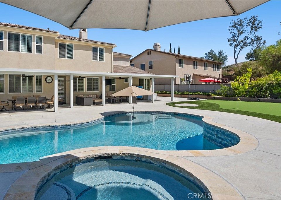 Step outside to your own resort-style retreat featuring a sparkling pool and spa, putting green with sand trap, and generous outdoor entertaining areas perfect for gatherings or quiet evenings under the stars.