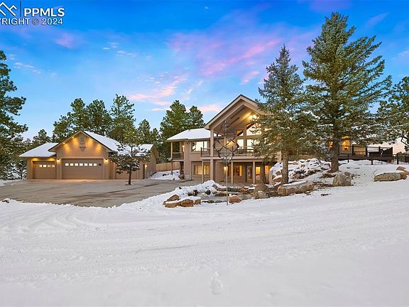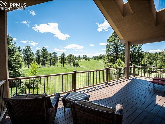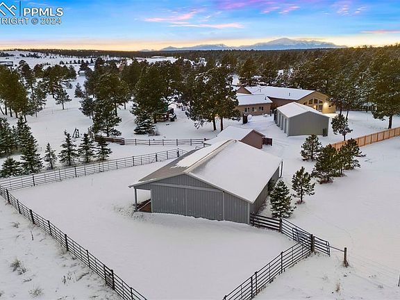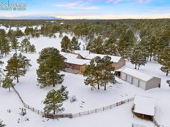 Phenomenal opportunity on 15 acres of lush green meadows and towering pines in sought after Black Forest! Custom built and remodeled home with almost 7,200 square feet w/ an indoor hot tub and pool with a water slide. Multiple heated garages w/ parking for 17 vehicles. 4 stall 32x48 barn with electric, tack room, large sliding doors. 50x36 heated detached garage, epoxy floors, built-in workshop cabinetry and sink. 48x24 detached metal garage with 4 - 10ftx10ft doors. 6 car attached finished, insulated and heated w/ 220V and 50 amp. Expansive and open floor plan flooded w/ natural light from the numerous over-sized windows. New wide plank white oak stone core flooring, high end 50 year rubber coated metal roof, new high end lighting throughout, central AC, multiple ensuite bedrooms, RH knobs throughout, Cambria counters, Brizo and Studio by McGee plumbing fixtures, new carpet, freshly painted. Gorgeous kitchen w/ a huge island, gas cook-top, new commercial grade appliances, huge pantry, slab granite counters. Massive great room w/ a wall of large windows, gas fireplace w/ entire wall of Telluride stone, wood beamed ceilings and large metal chandelier. Main level primary suite w/ private deck, walk-in closet and fully remodeled bath. The primary suite is spa like w/ a standalone tub, tub filler w/ wand, beautiful shower w/ multiple showerheads and wand, high end tile, backlit mirrors. Tons of outdoor entertaining space - a 40x14 covered wraparound composite deck, 14x33 patio, flagstone patio. Serene peaceful pond with two waterfalls and lighting. 10ftx6ft concrete safe room w/ steel door. Indoor pool w/ automated cover, automated chemical feed and test, a water slide, hot tub, wet bar and bathroom w/ 3 shower stalls. Walk-out finished lower level w/ wet bar w/ barrel ceiling, high end DaVinci fireplace and large family room. Perfect equestrian property w/ 3 well hydrants, multiple fenced pastures, perimeter fenced & gated. Whole house automatic generator. No HOA.
