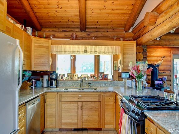 "ONE OF A KIND" Log Home w/unfinished basement, loaded w/potential living space down. Country Estate close to services on .55 acres, enjoy gorgeous Sunrise & Sunset Valley Views from 16 x 20 ft. deck & from upper Master Suite w/west facing windows! Log home rustic charm abounds w/ new quartz kitchen counter tops, wood stove in family room area.Brand NEW gas F/A furnace, NEW tankless hot water heater! Oversize garage ( 24 x 28 ), + 24 x 36 big shop w/ 12 x 36 Boat/R.V. carport & more, LOADED!!