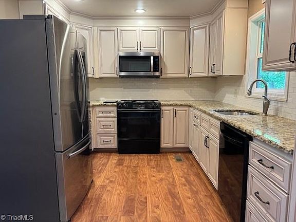 Wow! Beautifully upgraded kitchen with fabulous cabinets, granite countertop, stainless refrigerator, slide in range, tile backsplash, lots of drawers/lazy susan and pantry! Stackable washer/dryer combo and home security system remain. Gleaming laminate floors throughout, vinyl in bath, 3 bedrooms, eat in kitchen, and nice size living area. Replacement windows, large yard backs up to city owned park and nearby tracks, she shed/storage building remain. Come see it and make this lovely home yours!