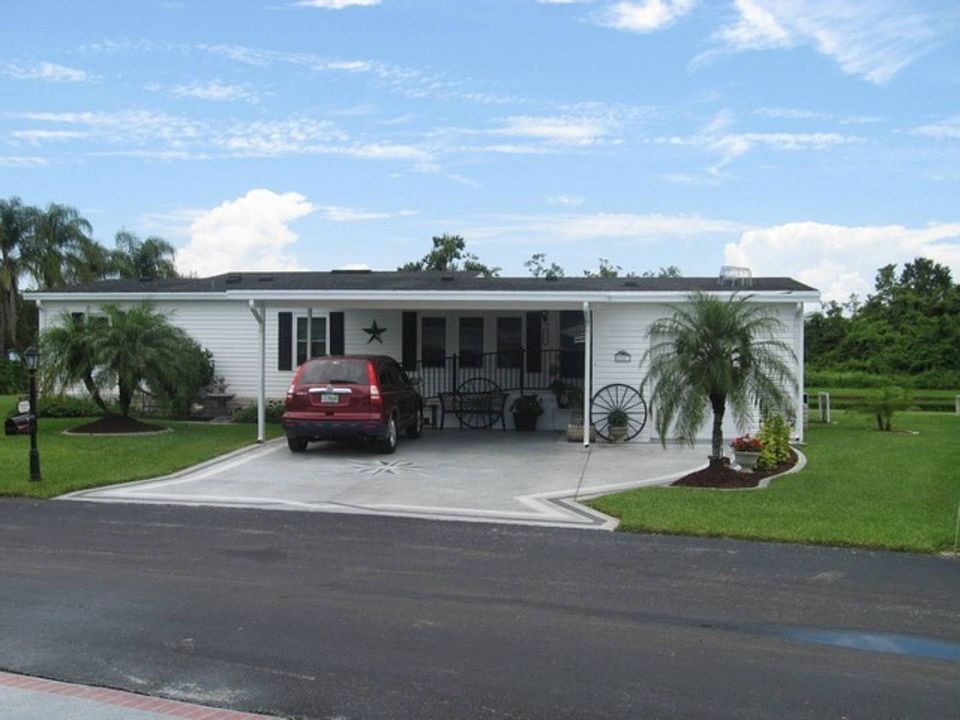 This absolutely stunning home is located in beautiful Four Lakes, a 55+ gated community with homes on lot leased land. Everything about this home screams "Updated!" It features an open, split floor plan, tape and texture in all rooms, three bedrooms, two baths, dining room and large family room, The eat-in kitchen has an abundance of oak cabinets, island, desk area, water purification system, newer appliances and a large walk-in pantry. The spacious master bedroom has a roomy walk-in closet and the master bath has upgraded vanity with his and hers sinks, lots of cabinets, walk-in shower and a cleverly placed laundry area with washer and dryer. How convenient is that? The 14' X 13' Florida room has acrylic windows, tiled floors and gorgeous views of the ponds, reserve and Lake Haines...which, by the way, has magnificent sunsets! You will love the beautifully landscaped yard with cement curbing around plant and flower beds. The extra-wide deco drive leads to the golf cart shed which includes a four-seater golf cart. This home has a newer roof, newer heat/air, newer appliances and double pane tilt windows. You can't ask for anything more, except maybe a nice patio...which it has!
