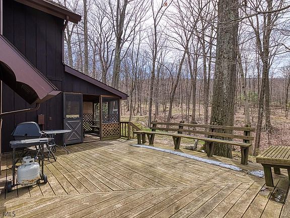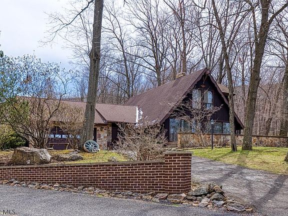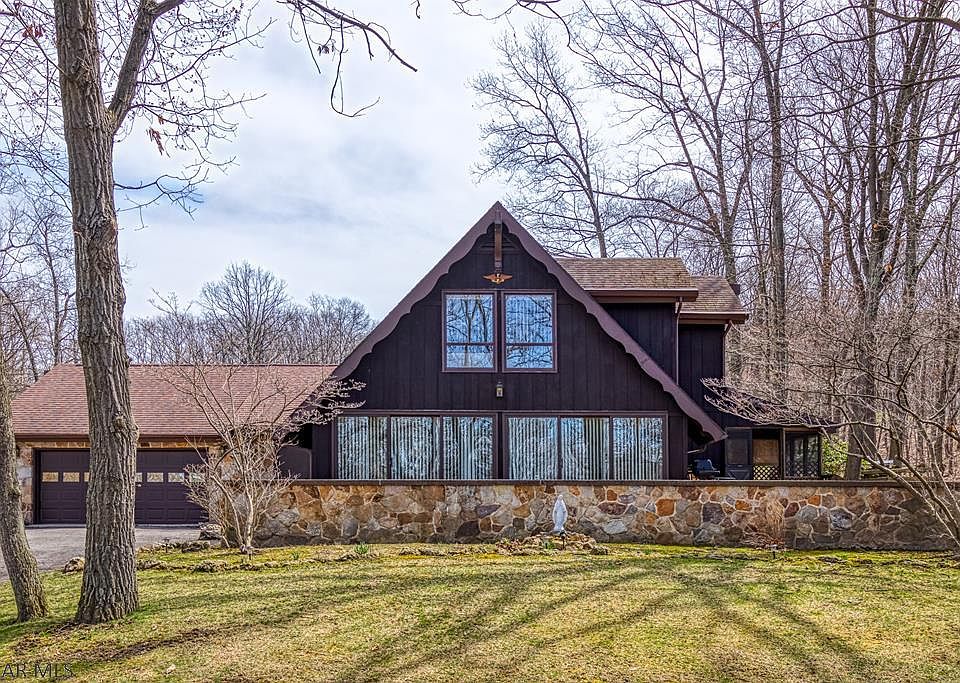 Peaceful living in A-Frame home on -1 acre lot. Wooded lot surrounding with stream flowing thru small wooded ravine, sitting area to enjoy nature. Home has plenty of space with 4 bedrooms, 2.5 baths (2 bedrooms 1st floor and 2 bedrooms 2nd floor.) 1st floor laundry - walk out to back yard, vaulted beam ceiling in Great Room, Stone faced fireplace, Dining Room has hardwood floors & wall of windows to enjoy setting, eat in kitchen with semi wrapped deck, covered deck area to enjoy your morning beverage. Some finishes in basement - walk out basement. 2 heat pumps, 1st floor and 2nd floor.