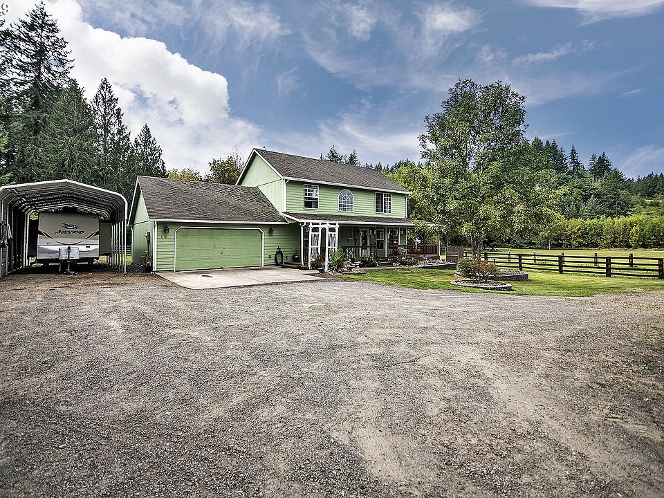 GREAT LOCATION-- HORSE PROPERTY-- 5 Acres-- 1976 Sqft-- 3+ Bdrm/3 Bath-- Living Rm-- Kitchen w/Open Concept-- Dining Area-- Office/Den-- Master w/Full Bath & Walk-in Closet-- Laundry Rm-- Heat Pump & A/C-- HardiPlank Siding-- Double Garage-- Covered Wrap Around Deck & Porch-- 30 x 48 Barn w/8 Stalls-- Riding Area-- Fenced & Cross Fenced-- Outbuildings-- 18X40 Covered RV Parking & Hookups-- Trees-- Garden Space-- Firepit-- Well-- Septic