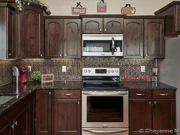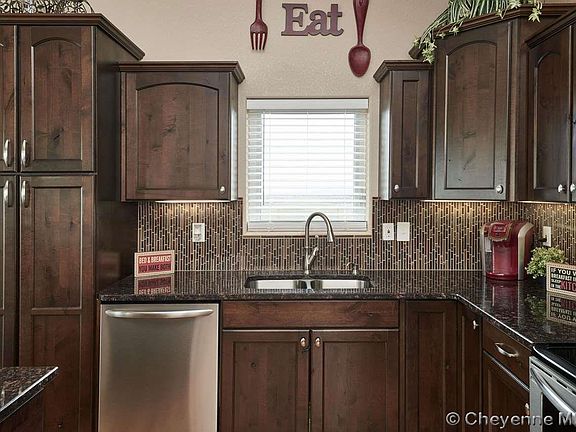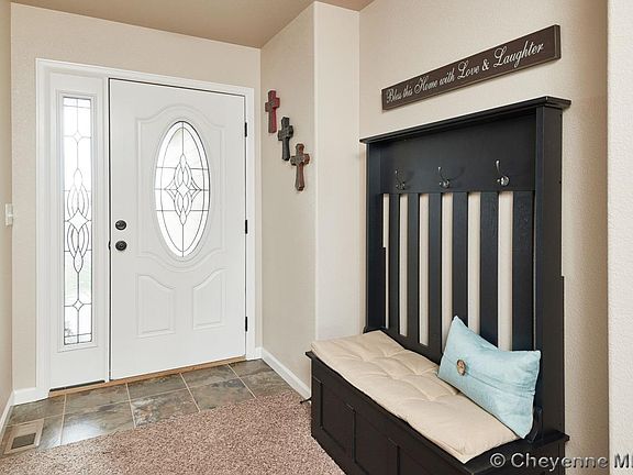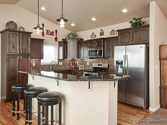 Wonderful split bedroom style 3 bedroom, 2 bath, 3-car garage rancher on 2.5 acres in desirable Bison Crossing location just North of Terry Ranch Rd. The home offers striking alder cabinetry with granite counters, wood floors, a large owners' suite with a 5 piece bath. The basement offers a large family room, perfect for sports and TV viewing. The home has central air, sprinkler system, and stunning views of the city of Cheyenne to the North.