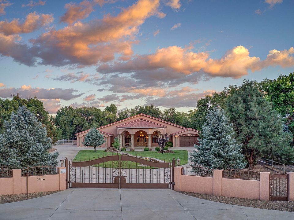 Stunning one owner custom built home located on 1.38 fully fenced acres of horse property with Bosque access. Enjoy the large Chef's Kitchen with granite counters, oven, microwave, gas range, copper sinks, double stacked dishwasher, built in coffee maker and a huge island and pantry. The spectacular primary suite includes an adjoining sitting room with a two sided gas fireplace, wet bar, mini fridge, and outside access to a private yard, a built in armoire with access to the laundry room and a large walk in closet. Primary bathroom has a jetted tub, separate shower with dual shower heads, and double sinks with a vanity.Two living areas include a formal living room and a huge family room with surround sound, gas fireplace, ceiling fans, and a wet bar with icemaker and mini-fri