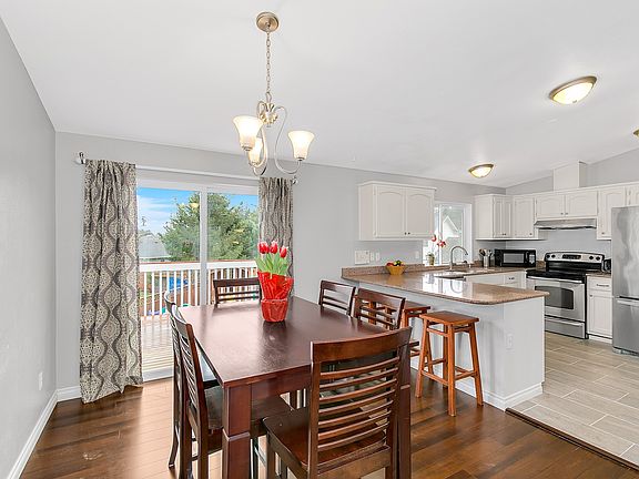 Delightful 5 bedroom home ideally located in a quiet cul-de-sac w/ lovely views of Little Mountain! Light filled living/dining areas w/ vaulted ceiling, cozy FP & dark wood strand bamboo floors. Chef's kitchen w/ solid surface counter, stainless appliances, breakfast bar, pantry & tile floor. Lower level family room w/ FP. Lovely yard w/ water feature, garden boxes, 2 storage sheds, deck & plenty of room to garden & play. Oversized driveway can accommodate an RV. Close to schools, shopping & trails.
