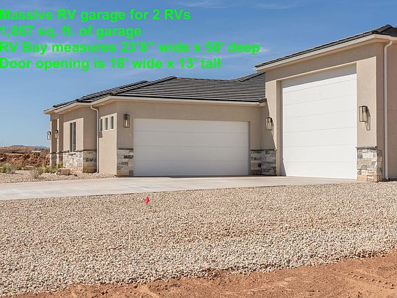 This brand-new home was just finished and it is ready for you to occupy! Check out the massive double RV garage bay that measures 23'8'' wide by 50' deep, big enough for two motorhomes to be parked side by side! The RV bay door is 18' wide and 13' tall. Buy this home, and you'll have a place for all the toys that are necessary for enjoying the adventures and lifestyle that we all enjoy in Southern Utah. Oh, did you see that this home sits on a half-acre of ground? Welcome home to your slice of paradise. Back and side yard landscaping and block walls can be added for an additional price. You'll love the large casita with its own entrance and separate heating and air conditioning. Best of all, there is a direct connection between the master suite and the laundry room. The builder has thought of everything, making this the ideal home. This home is constructed by Alan Gren Enterprises. Building quality custom homes in Southern Utah for over 25 years, Alan Gren produces beautiful homes that stand the test of time. The adjacent lot to the south and the lot behind that are also available. Purchase all 3 properties and you would have 1.5 acres of paradise. See MLS#s 23-238465 and 23-238466.