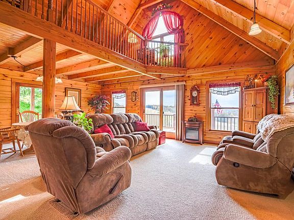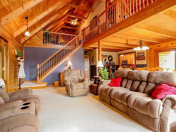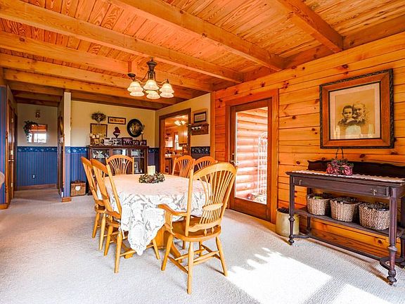 This 3120 sq.ft. log home is nestled on 20 +/- secluded acres with panoramic views. Handsome floor to ceiling exposed log work, cathedral vaulted & raised ceilings, full-service appliance filled kitchen with custom cabinets, main floor master suite, loft, bonus room above the garage, finished w/o basement with separate kitchen, living room, bedroom, &bathroom which could be a mother-in-law suite, geothermal heat, outdoor wood burner & so much more! Exterior home features a covered porch that wraps around the home, detached garage, shed, multi-level deck, several sitting & entertaining areas that overlooks the valley, pasture and Apple Valley Lake! Newer roof and logs were sanded and re-stained which should last a long time.