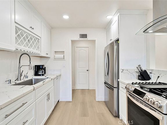 Beautiful fully remodeled home perfectly positioned on a corner lot along a peaceful, single-loaded street in the popular Dutch Haven neighborhood. Offering over 1,400 square feet of well-designed living space, this residence includes 4 spacious bedrooms, 2 updated bathrooms, and a large, permitted sunroom. Step into a light-filled open floor plan enhanced by elegant luxury vinyl plank flooring throughout. The gourmet kitchen features brand-new quartz countertops and backsplash, upgraded stainless steel appliances, shaker-style cabinets, and a convenient breakfast bar. The primary suite provides a relaxing retreat with a newly renovated en-suite bathroom, complete with stylish fixtures and a beautifully tiled walk-in shower. Additional upgrades include fresh interior paint, recessed LED lighting, designer light fixtures, dual-pane windows, and more. The sunroom opens to a serene backyard with a brick patio and vibrant bougainvillea. The home also offers fantastic curb appeal and an oversized driveway leading to an attached two-car garage. Enjoy an unbeatable location just minutes from top dining, shopping, entertainment, freeway access, and the beach. This home truly captures the best of Huntington Beach living.