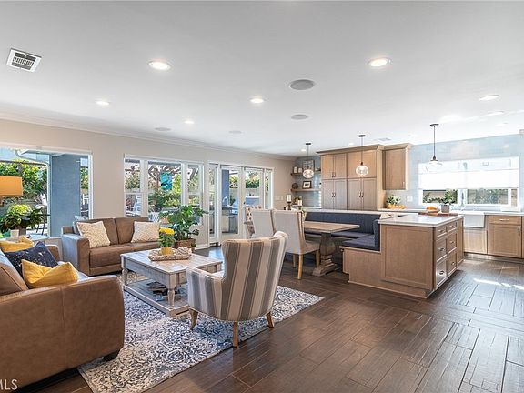 “Coastal chic” is the best way to describe this single-story stunner that has been thoughtfully upgraded inside and out. There is so much to appreciate! Stepping inside you will find a welcoming foyer with rich natural light pouring into the open concept living space. Your eyes are automatically drawn to the oversized windows that beautifully highlight a professionally landscaped backyard featuring stainless-steel BBQ and appliances, a generous seating area with gas fireplace and TV hookups. For ease of upkeep, the backyard hardscape is combined with turf, and a covered patio allows for outdoor enjoyment year-round. Back inside through the double doors, a soothing, neutral-palette gourmet kitchen is truly the heart of this home. It features soft-close cabinets and pull-outs, quartz countertops, a Thermador cooktop and other high-end stainless-steel appliances, and a convenient built-in seating area that connects to an open-concept family room making entertaining a breeze. The upgraded windows and sliders bring the outdoors in, while wood-look tile flooring throughout the home provides an air of casual sophistication. This popular floorplan offers 4 generous bedrooms, accented by an oversized primary bedroom with walk-in closet, a gorgeous ensuite remodeled bathroom with dual sinks, a soaking tub, privacy water closet and side-door access to the entertainer’s yard. Three additional well-appointed bedrooms feature neutral carpet, designer wallpaper and abundant natural light. The shared hallway bathroom has also been updated with today’s modern palette and finishes. Custom window treatments, A/C, and a garage with epoxy flooring, a pull-down access ladder for storage and built-in cabinetry round out this one-of-a-kind property. Located near Meadowlark Golf Course, the Bolsa Chica Wetlands and award-winning schools, this property is a 10+. Welcome home!
