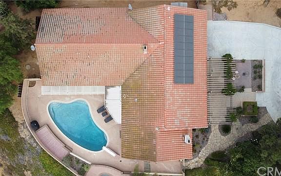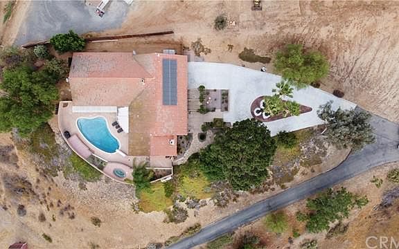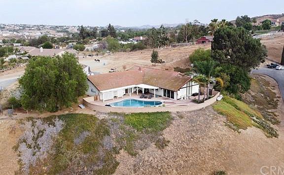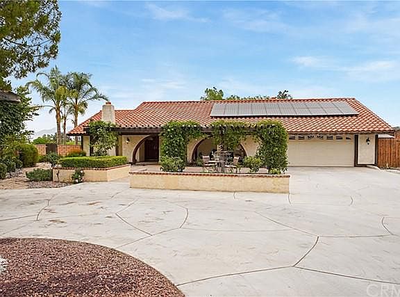 This private hilltop estate in Riverside has everything on your list: Expansive views? Check. A backyard oasis? Check. Solar power, plenty of parking and lots of natural light? Check, check & check! This Mediterranean-style home sits atop a long, circular driveway lined with mature trees. The curb appeal wows with a landscaped courtyard, a trellis and beautiful archways on the faade. Step into the foyer to find vaulted, timber-framed ceilings, Spanish tiles and a cozy brick fireplace. But your eye will be immediately drawn to the huge triple-sliding door that leads out to that fantastic backyard. This space has something for everyone -- you can grill up dinner uder the covered patio, while guests relax in the pool. All of you will appreciate those stunning canyon views in every direction. Back inside, your spacious kitchen includes granite countertops, recessed lighting, tons of cabinet space and a breakfast bar overlooking the dining area. The rest of the home has a great layout, with the primary suite getting its own wing with pool access. The guest rooms share the hallway bathroom, which has been updated with all of the same finishes found in the primary ensuite. Theres even a bonus room that would make a great office or remote-learning spot. This property includes eight conventional parking spots, plus a spot to store your RV or boat. Lots of buyers are searching for a MOVE-IN-READY home with a pool, land, views and lots of privacy -- just like this one. Make your appointment before someone else does.