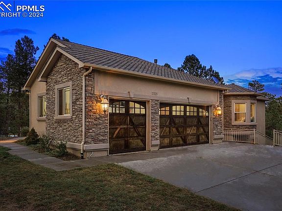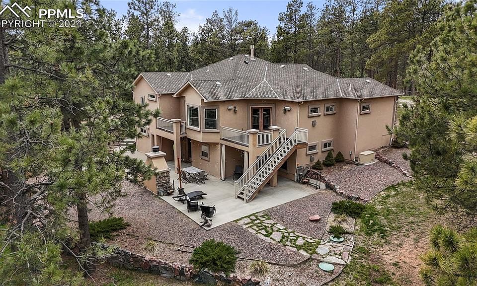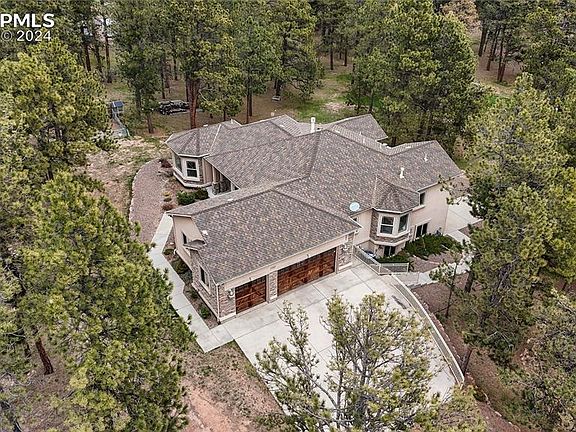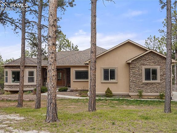 Idyllic haven where nature’s beauty harmonizes w/ luxury living. Custom rancher w/ over 4,000 sq ft and 49x36 RV garage perfectly situated on 5 acres of towering ponderosa pines in tranquil Black Forest. New class 4 impact resistant roof is being installed. The main floor was designed for entertaining w/ open spaces and huge high end Atrium windows that flood the rooms w/ natural lighting. Well appointed kitchen w/ knotty alder cabinetry, slab granite counters, 5 burner gas cook-top, convection oven, under cabinet lighting, pantry and island. Expansive dining room w/ bay window and beautiful chandelier. Main level primary suite w/ 2 sided fireplace, bay window w/seat, walk-in closet, jetted rub, marble counters & over-sized shower w/ seamless glass. There are two bedrooms on the main level & two bedrooms on the lower level. Finished walk-out lower level w/ 10ft ceilings, 500 bottle wine cellar, theater room w/ speakers, projector & large screen. Spacious family room w/ secondary kitchen/wet bar and game area. The acreage is fully animal fenced and gated. 49x36 detached RV garage that is finished, insulated, heated, storage cabinetry and finished w/ the same exterior stucco and stone that is featured on the home. The RV garage is spacious enough to house a Class A motorhome w/ plumbing, built-in cabinetry, 2 car overhead door and an oversized 14ft RV door. The outdoor entertaining space is perfection, a location where time is spent taking in the serene surroundings and best amenities – stone exterior fireplace, built-in grill, outdoor speakers, two decks w/ metal railings, large patio, prewired for a hot tub, flagstone walkways, boulder retaining walls & lush grasses. No HOA just light covenants. Zoned for horses and other animals. Central AC, natural gas generator,4 fireplaces,3 car attached garage. Award winning School District 38. Only 45 mins to Denver or 15 mins to Colorado Springs. Fantastic access to I-25 and Highway 83. All paved roads to the property