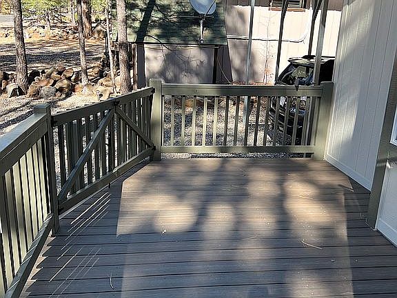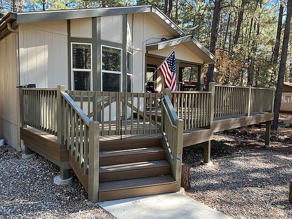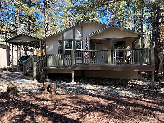 New CAVCO built in 2022. Vaulted ceilings with solar lights in kitchen and laundry rooms. Refrigerator, microwave, dishwasher, ceiling fans, fireplace, and front and back decks. Heavily treed lot with extended front deck and covered parking. Two full baths and separate laundry room with built in sink. Fenced yard. Fire pit, outdoor lighting. Shed. Beautiful lot. This property is in Munds Park. Many extras.
