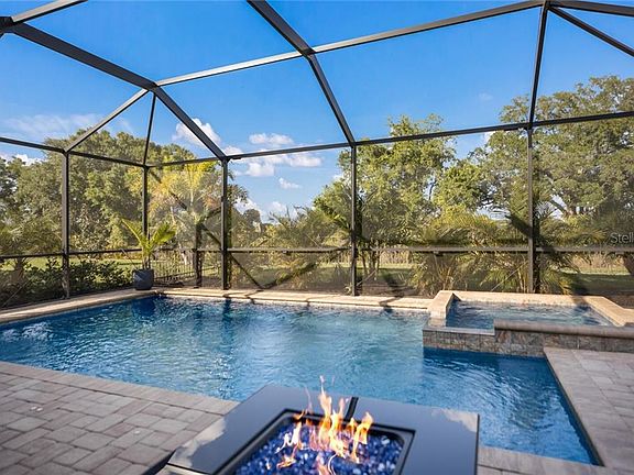 The gated community of Polo Run is where you will find this beautiful 3 bed 3 full bath pool home with many desirable features such as a rare fenced in backyard that backs up to trees and a pond for desired privacy where you can enjoy the gorgeous heated pool and spa. The covered lanai flows perfectly from the open floorplan to make indoor/outdoor entertaining a breeze. No carpet throughout the home, an open kitchen with a spacious quartz island, stainless steel appliances including natural gas stove, smart home technology, ring doorbell, tile roof, tankless water heater, and gutters all around are some of the other features of the home. Polo Run is the only solar powered gated community within Lakewood Ranch. Don't wait to build, this 2018 home doesn't have the builder's fees that the new construction homes have. Take advantage of the rare opportunity to own a pool home in a gated community within Lakewood Ranch that has a clubhouse, resort-style pool, BBQ area, tennis, pickleball, bocce ball, basketball, dog park, playground, fitness & aerobics studio. There's plenty to do inside the community and it is located close to abundant shopping & restaurants, 3 major airports, UTC mall, several schools, parks, Premier Sports Soccer fields, and much more.