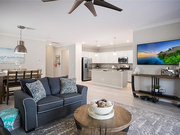 • Interior Features: Ceiling Fans(s), High Ceiling(s), Master Bedroom Downstairs, Open Floorplan, Split Bedroom, Stone Counters, Walk-In Closet(s), Crown Molding, Thermostat, Kitchen/Family Room Combo, Living Room/Dining Room Combo, Solid Surface Counters, Window Treatments, Tray Ceiling(s)