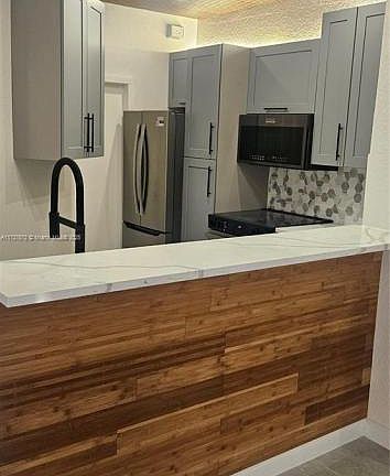 - Exterior features: Modern design with a vanity, countertop, and sink, Recessed lighting and the floor is tiled, Stainless appliances, sleek black fixtures