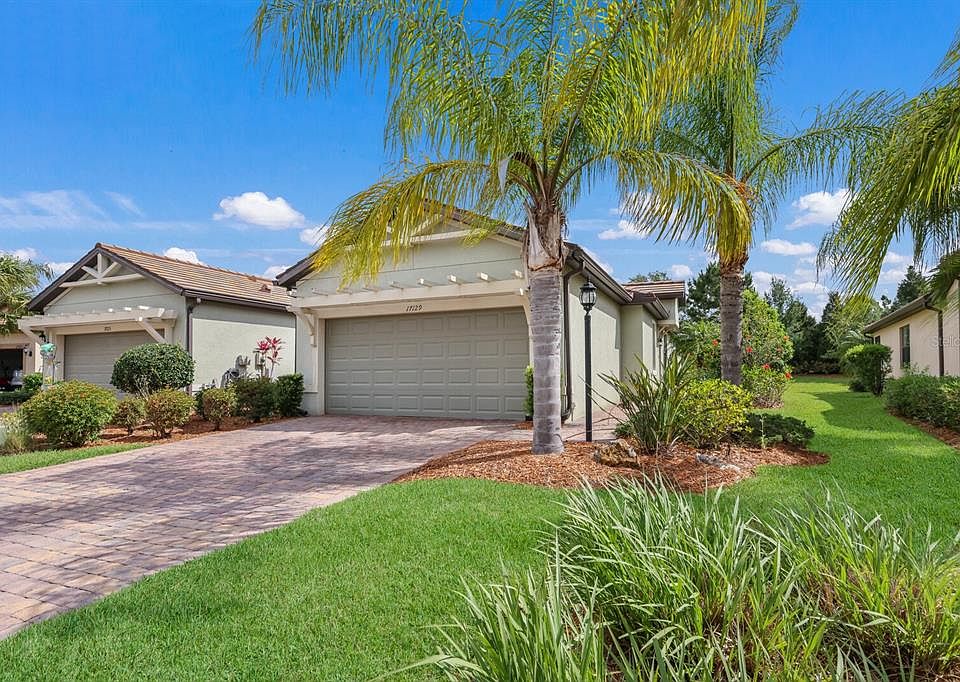 Welcome to this charming and chic villa in the desirable Del Webb community of Lakewood Ranch. Enter within and discover a home designed for both relaxation and entertaining, with an oversized extended lanai featuring an outdoor kitchen that becomes an additional living area, perfect for lounging, watching TV, and hosting guests in complete privacy. Hurricane roll-down screens on the lanai provide peace of mind during storm season, and the outdoor kitchen makes al fresco dining a breeze. Located on a quiet cul-de-sac, this villa features on-trend tile flooring throughout and appealing neutral paint, providing the perfect canvas for adding your own personal style. The split floorplan offers privacy, with the spacious owner's suite boasting custom closets. There’s a generously sized den with glass French doors. The guest bedroom includes a large walk-in closet, and the laundry room features built-in cabinetry for added convenience. The kitchen is a chef's dream, with soft ivory cabinets, granite counters, gas cooking, closet pantry, and breakfast bar for casual dining. The garage is equipped with a soaking sink and an epoxy-painted floor, adding to the home's functionality. Ideally located within the community, it is just a short stroll to the clubhouse, where all the social activity takes place. Del Webb is a maintenance-free, gated, resort-style community offering an array of social activities and clubs with planned events and outings. Enjoy the benefits of the full-time social director, fitness center, clubhouse, full-service restaurant, and bar with outside dining overlooking the lake. Rounding out this desirable community is a heated resort-style pool, fire pit area, walking trails, dog park, bocce ball, pickleball, and tennis courts. Experience the ultimate in Florida living.