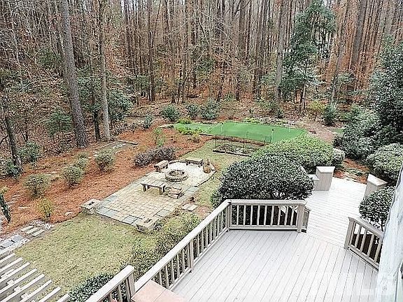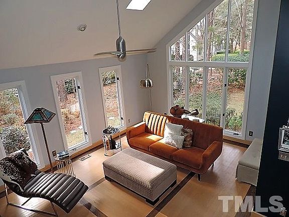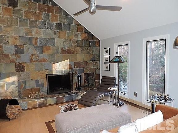 Seeing is believing! Finally a well-priced home with extraordinary living spaces designed to capture light in the supremely livable open floor plan. Hardwood, slate, granite, stone and tile finishes are complemented by updated paints and new light fixtures, stunning wood accented vaulted ceiling in Master, and dramatic masonry fireplaces. Step outside and you're swept into a private vista of the acre+ lot. Family fun here- putting green, fire pit, backs to buffer around Falls Lake, easy 500' walk to lake!