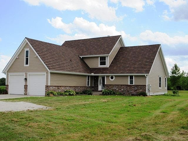 $3K carpet allowance w/acceptable offer. Enjoy county living close to the city. This well maintained custom built home sits on 10+/- Acres & has much to offer. Located less than 20 mins from Lees Summit. The inviting open floor plan & open space on this amazing property makes entertaining a breeze. There is plenty of room on upper level for kids & guests, & the convenience of the Master Suite, Laundry RM and Office on the main. A huge 4th upstairs bedroom is non-conforming w/out closet. At the end of a long day